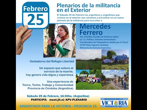 Emisión en vivo - Plenarios de la Militancia en el ExteriorConversamos con Mercedes Ferrero. Dra. Estudios Sociales de América Latina. Lic. Cs. Política. Docente Universitaria. Coordinadora de Trabajadoras Unidas por la Tierra (UTEP Rama Agraria Córdoba). Referenta de Comuna Esperanza. Sábado 25 de Febrero, 16.30 hs. Argentina (20:30 hs Europa) Refugio Libertad, un espacio que estuvo al servicio de la muerte, hoy genera vida digna y esperanza. Trabajadores y trabajadoras de la economía popular que habitan en pequeños pueblos y zonas rurales de los departamentos Calamuchita y Santa María, provincia de Córdoba (Argentina). En 2018 recuperamos el predio del exGrupo de Artillería 141 ubicado entre Villa San Isidro, José de la Quintana y Los Molinos; logramos el permiso de uso legal otorgado por la Agencia Administradora de Bienes del Estado (AABE), allí gestamos el Refugio Libertad, un campo comunitario donde producimos alimentos sanos y creamos trabajo para más de 60 familias, con cuidado del territorio y el ambiente (ganadería mayor y menor, producción de forrajes y granos, horticultura, apicultura, cunicultura, reciclado y recuperación de infraestructura abandonada, entre otras actividades. Una experiencia de Tierra, Techo, Trabajo y Conectividad